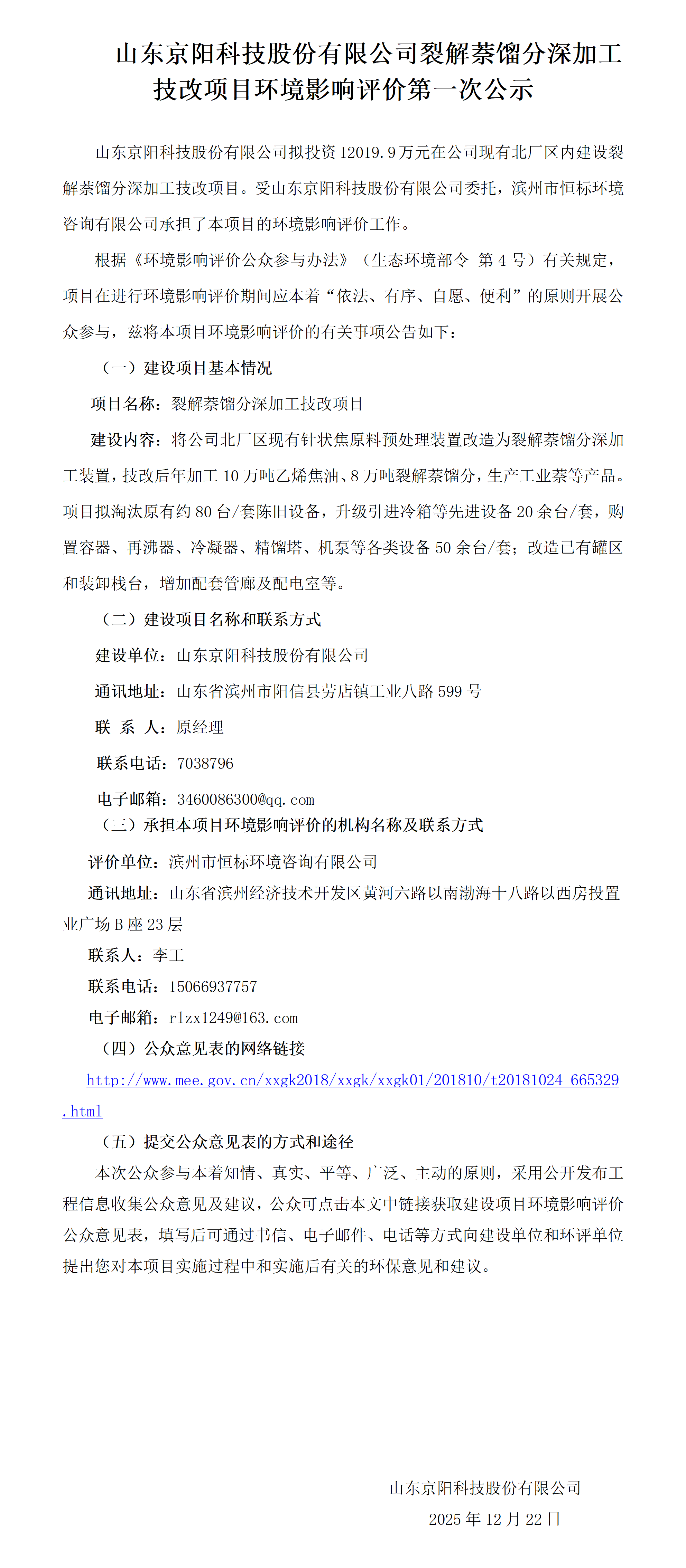 山东京阳科技股份有限公司裂解萘馏分深加工技改项目环境影响评价第一次公示